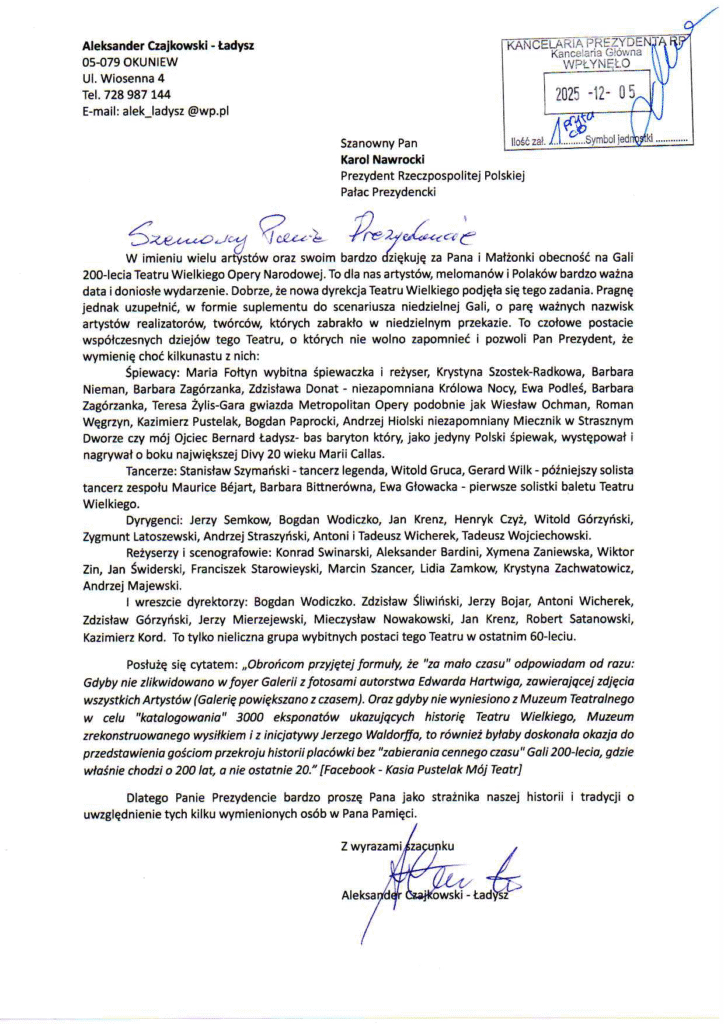Echa jubileuszu Teatru Wielkiego Wysłane przez admin | gru 11, 2025 | Aktualności, Komentujemy | 0 | Po obchodach jubileuszu Teatru Wielkiego nasz kolega z OW SDP, Aleksander Czajkowski-Ładysz skierował do Prezydenta RP list, który publikujemy poniżej.