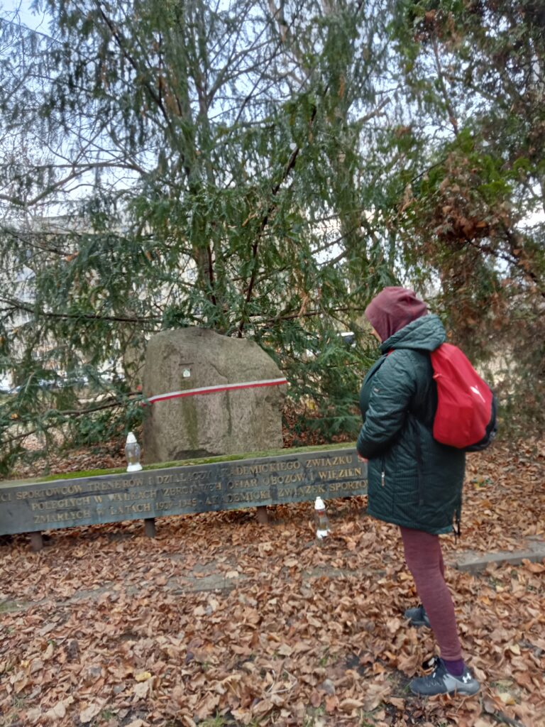 Podczas spaceru jedną z głównych alei zatrzymałyśmy się przy pomniku Sportowców, Trenerów i Działaczy Akademickiego Związku Sportowego Poległych walkach zbrojnych, Ofiar obozów i więzień – zmarłych 1939-1945, ufundowany przez Akademicki Związek Sportowy. Zdjęcie poniżej.